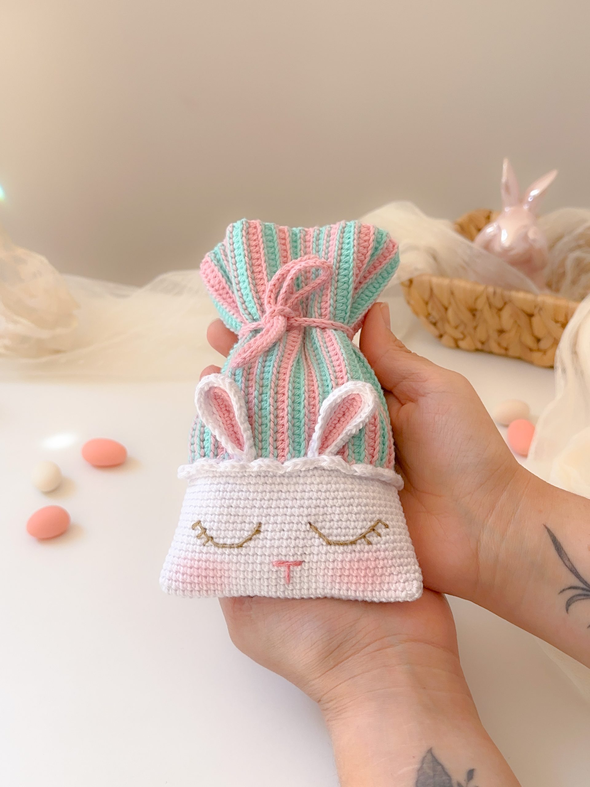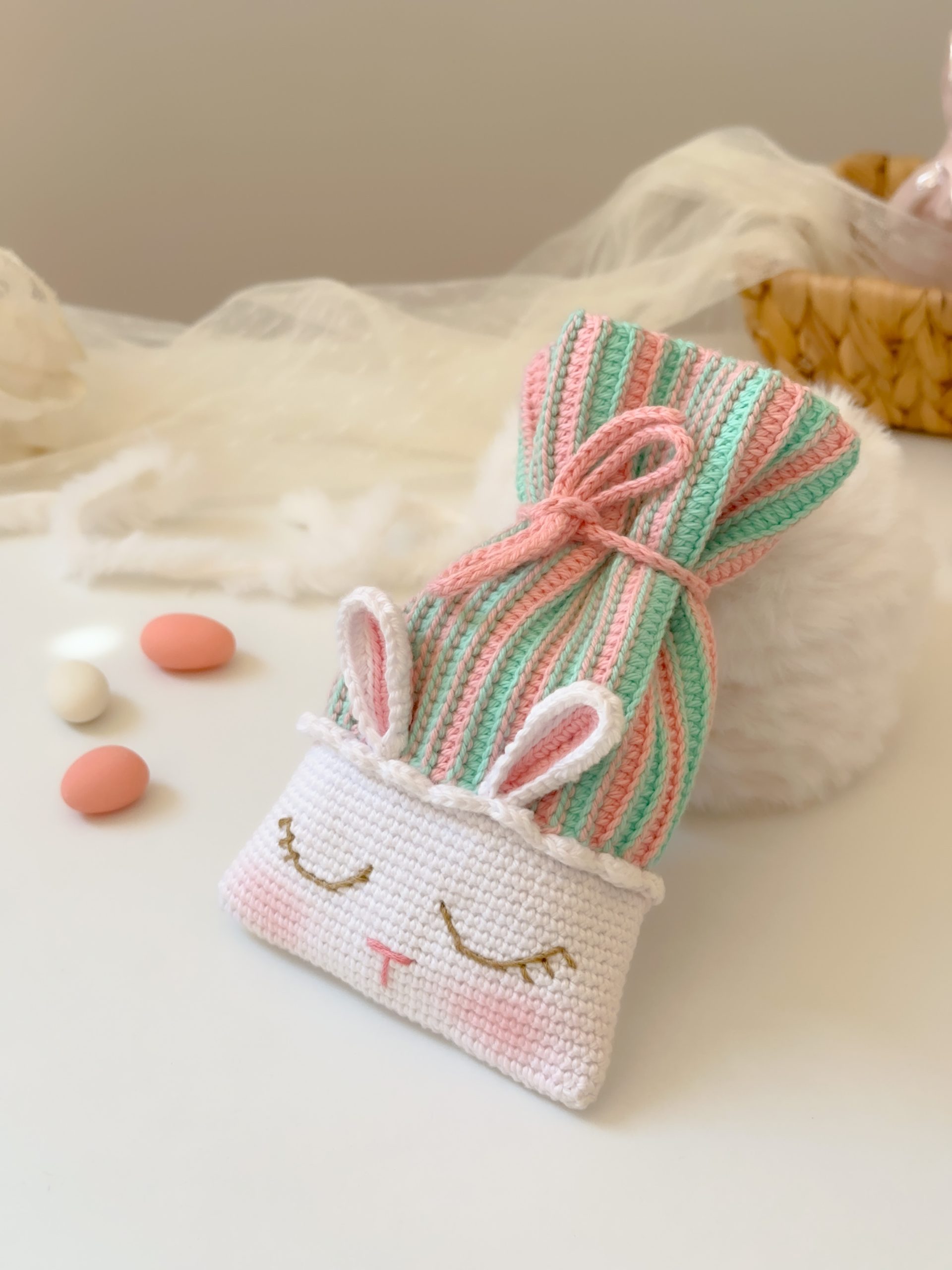 Este adorable saquito con carita de conejito es perfecto para guardar huevitos de Pascua, dulces o pequeños regalos. Su diseño tierno y delicado lo convierte en un detalle ideal para sorprender a niños y adultos.